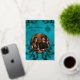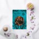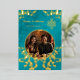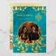 This elegant Tibetan wedding invitation features a round photo surrounded by real gold foil cherry blossom branches and a real gold foil endless knot symbol on a shimmering floral turquoise background. Bride and groom names in an elegant classic script.