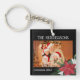 Poinsettia family photos Christmas keychain with year and stylish black and white floral clip art.