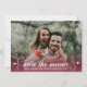 Photo Christmas Pregnancy Announcement Cards. Expecting parents! Modern white hand lettered swirly typography script "the more the merrier" text with red gradient card to share your happy news with family and friends in the holiday season. At the backing snowflakes on red colour background. You can personalise the design by replacing the sample text and horizontal photo. #3344