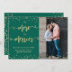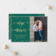 Photo Christmas Pregnancy Announcement Cards green and gold. Expecting parents! Modern gold swirly hand lettered typography script "the more the merrier" card to share your happy news with family and friends in the holiday season. Features above and the bottom gold confetti frame on dark forest green colour background. You can personalise the design by replacing the simple texts and vertical photo. #3351 If you need help or matching items, please contact to me!
