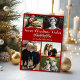 Tropical themed Christmas family photo card with a place for five pictures. Traditional red and green colours with "Warm Christmas Wishes" greeting, or change it, with starfish and holly design.