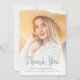 Modern graduation thank-you card featuring a custom vertical photo on the front and a horizontal photo on the reverse. The words "Thank You" appear in dusty blue script, with your name and year of graduation below in sans serif font. Personalise the reverse side with a message of your choice in white sans serif on a dusty blue background and add your signature line in handwriting script. Easily replace the sample images with your own photos. A white gradient screen helps ensure the text on the front of the card pops. Ideal for high school or college graduation.