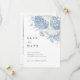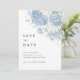 A timeless Dusty Blue & White floral photo save the date featuring soft watercolor hydrangea artwork on the front and a full-photo back layout for your engagement or couple photo.