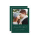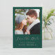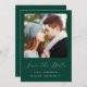 This simple, minimalist Save the Date card features a square photo above the words "Save the Date" in elegant blush pink handwriting script, followed by the couple's names, wedding date and city in sans serif font on an emerald green background. Add a more detailed message with additional information on the reverse, along with a QR code to help your guests visit your wedding website.