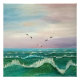 A serene painting of the sea captures the rhythmic movement of waves, rolling gently yet powerfully under a vast sky. White-tipped waves crest along the deep blue water, each one reflecting a touch of sunlight. In the foreground, seagulls glide gracefully over the water, their wings spread wide, casting delicate shadows on the waves below. The horizon stretches endlessly, blending soft hues of sky and sea, creating a feeling of openness and freedom. The scene is peaceful yet alive with the sound of waves and the distant calls of the seabirds.