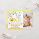 Sweet bumble or honey bee themed first birthday invitation for a little girl featuring a mostly yellow floral arrangements and four cute bumble bees and an area for a photo.