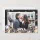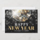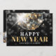 Horizontal Black and Gold Happy New Year Card. Celebrate the new year in style with this chic black and gold design featuring a bold disco ball at the top centre of the front. "Happy New Year" is written in a mix of gold and white serif fonts, with space below to personalise with a name or names. The black background adds a sleek, modern feel without any glitter—just bold colour for a polished look. On the back, the same festive disco ball design continues, with space to feature one photo as well as the year date. All text and colours are fully customisable, making this a great choice for sending New Year wishes to friends, family, or colleagues.