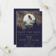 Modern simple faux gold palm tree with simple typography, a trendy and tropical save the date wedding theme on palm tree leaf on navy blue. Add your couple photo
