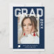 Photo Graduation Party Elegant Modern Script Invitations feature your favourite photo with the simple white text "Grad (year)" and your name and personalised graduation details on the front on a blue background. On the reverse add an additional picture with your graduation invitation information below. Personalise by editing the text in the text boxes provided. Created by ©Evco Studio www.zazzle.com/store/evcostudio
