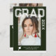 Photo Graduation Party Elegant Modern Script Invitations feature your favourite photo with the simple white text "Grad (year)" and your name and personalised graduation details on the front on a green background. On the reverse add an additional picture with your graduation invitation information below. Personalise by editing the text in the text boxes provided. Created by ©Evco Studio www.zazzle.com/store/evcostudio