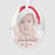 Help them celebrate their first grandchild with this beautiful modern keepsake ornament. The burgundy red text reads "Our first Christmas as grandparents," with the word "grandparents" in elegant handwriting script with flourishes before and after. Easily replace the sample image with your favourite photo of the new baby, and add his or her name and the year. A white gradient filter helps make the text pop.