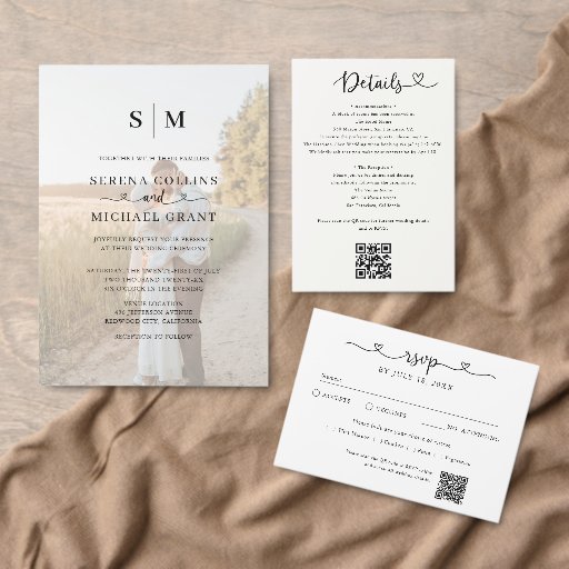 Photo Heart Script QR Code Wedding Invitation