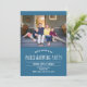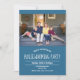 A housewarming invitation with customisable text. The photo is a template and meant to be swapped out for your own. The invitation has a blue background, white text, and a pattern of white outline houses on the back.