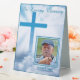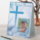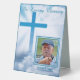 These tabletop signs featuring a photo of your deceased loved one are great to use in a variety of locations at your final remembrance service: with the guest book, on hallway tables or bookcases, side tables, as part of a centerpiece grouping. It is simple to personalise as you swap a photo of your loved one along with birth and death dates. The background is a gorgeous photo of sunshine lit white clouds surrounding a bright blue Christian Cross.