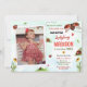 This cute invitation for girls first birthday party featuring polka dot ladybugs, flowers and some greenery around.