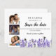Decorated with watercolored lavender florals. A Save the Date card for your wedding. The text: Save the Date is written with a large trendy hand lettered style script. Personalise and add a 3 photos.