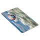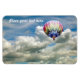 Rainbow coloured Hot Air Balloon is flying high in the fluffy white clouds in a blue sky. Personalise with your own motivational text.