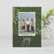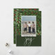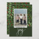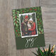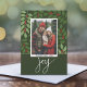 A modern Merry Christmas photo card in green, red and white. The modern, abstract design includes eucalyptus branches and berries and sans serif type for the main part of the text. The greeting is in a rustic modern script. The back includes a eucalyptus pattern in greens and white.