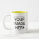 This range of customisable coffee mugs comes in 2 sizes - 11oz and 15oz. The cups are plain white on the outside and coloured on the inside, with this particular one being bright yellow. The template allows for you to upload two (2) or more images to the face of the mug and to add your own personal wording. There is no restriction on the numbers of colours you may add, the number of photos you may upload or volume of text you may include. The face of the mug may be changed from white to any one of the background colours offered.