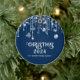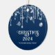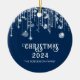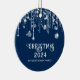 Photo navy blue and white string lights sparkles Christmas ornament with family name for a festive Holiday party.