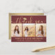 Send a stylish note of gratitude with custom 3 photo collage burgundy and gold graduation thank you postcards. All pictures and wording are simple to personalise. (IMAGE PLACEMENT TIP: An easy way to centre a photo exactly how you want is to crop it before uploading to the Zazzle website.) This template can be customised with any wording of your choice such as future education plans, new job position or favourite inspirational quote. If you prefer to hand write your message, simply delete the example text or use the extra space above the new address and contact info. Design features a maroon red ombre background, faux foil mortar board cap, handwritten style script calligraphy, modern minimalist typography, and three photos of your choice, such as senior pictures or images from the commencement ceremony. Please note that gold is printed colour, not metallic foil. These elegant personalised cards are a trendy and chic way to thank family and friends for sharing your graduation celebration. Congratulations to the graduate!