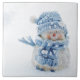 Ceramic tile with a cute photograph of a little snowman. Standing outside in the winter with snow falling all around. This cute little guy is dressed up in blue knitted hat and scarf.