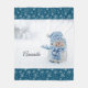 A blanket with a cute photograph of a little snowman. Standing outside in the winter with snow falling all around. This cute little guy is dressed up in blue knitted hat and scarf. Snowflake pattern with a dark blue background along the top and bottom border.