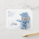 A postcard with a cute photograph of a little snowman. Standing outside in the winter with snow falling all around. This cute little guy is dressed up in blue knitted hat and scarf.