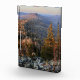 photo of a mountainous autumn forest, mountains, pine trees, and bright yellow trees