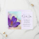 Save the date card with a lovely photograph of a dark purple crocus set inside a glass jar. A light purple blossom in present in the background.