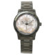 A geode photo fills the face of this watch. The geode is a brown and white agate with quartz crystal druzy. The quarter hours are marked with numbers.
