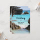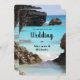 Wedding invitation with a scenic photograph featuring Bermuda's tropical coast. Big jagged rocks contrast with the bright turquoise sea.