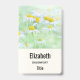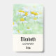 Personalised name tag with a fresh and summery photograph featuring a collection of wild daisies with big yellow centres growing in a green field.