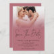 Modern Photo Overlay QR Code Rose Gold Black Script Wedding. With a QR code to your wedding website on the back so your guests can easily visit your wedding website. Your QR code will be automatically generated to update the sample code in the design, when you simply change the sample URL in the template with your own wedding website URL. Save The date is in a stylish set script. Replace the sample photo with your own favourite and personalise the rest of the text.