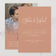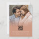Photo Overlay Script QR Boho Wedding Terracotta. Printable or printed. Bohemian vibes with earthy colours cream typography on soft terracotta. Change text as required and replace the sample photo on the back with your own favourite. With a QR code to your wedding website so your guests can easily scan it and see more details. Your QR code will be automatically generated to update the sample code in the design, when you simply change the sample URL in the template with your own wedding website URL