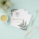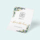 A chic white background. Decorated with green watercolored eucalyptus leaves, sprigs, greenery, faux gold leaves. With a camara icon, the text: Photo and Share the love. Personalise and add your event #. Black and golden letters.