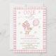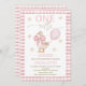 One silly goose first birthday invitation featuring a cute goose, pink bow and balloon, and a modern calligraphy word in brown. This one silly goose birthday invitation also features some daisies and a pink plaid pattern.