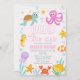 First birthday invitation for a baby girl featuring various sea creatures or sea critters and some seaweed. This girl's under the sea birthday invitation has a photo on the back and is ideal for a girl's under the sea themed first birthday party.