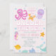 First birthday invitation for a baby girl featuring various sea creatures or sea critters and small mermaid tail. This girl's under the sea birthday invitation has a photo on the back and is ideal for an under the sea themed first birthday party.