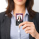 A modern photo press badge ID with name on burgundy red. .Simply add your photo and information. This version comes with a lanyard, but you may choose your style of attachment that includes, lanyard, metal clip or retractable, or no attachment.