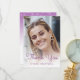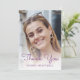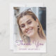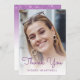 Trendy modern birthday thank-you card featuring a custom vertical photo. The words "Thank You" appear in purple handwriting script overlay, with the name below in sans serif font. Easily replace the sample image with your favourite photo. A white gradient screen helps ensure the text pops. The reverse side features a purple dripping faux glitter border on an ombre background.Customise the text with your own thank-you note, or delete it to provide room for individual handwritten messages.