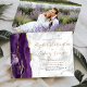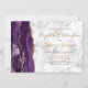 The left-hand edge of this elegant modern wedding invitation features a purple watercolor agate border trimmed with faux gold glitter. The customisable text combines black and gold-coloured handwriting, copperplate and italic fonts on a grey and white marble background. Easily replace the sample image on the back with your own horizontal photo.