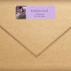 Personalise and add your photo, name and address. Purple letters. Violet, lavender coloured background.