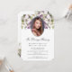 Elegant purple and white floral photo memorial service/celebration of life/funeral/in loving memory invitation featuring a photo adorned with purple and white calla lilies.