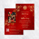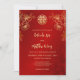 This elegant Chinese wedding invitation features a photo, a golden double happiness symbol and gold flowers on a floral ruby red shimmering background. Bride and groom names in an elegant handwritten script. Chinese wedding invitation or tea ceremony invitation.