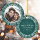 Pine green, round Christmas ornament featuring your custom photo inside a retro sunburst border. Customisable text "Merry & bright" on the back along with the family name and year.