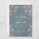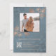 This elegant wedding invitation features a photo and and rose gold flowers on a dusty blue background. Bride and groom names in an elegant handwritten script.