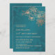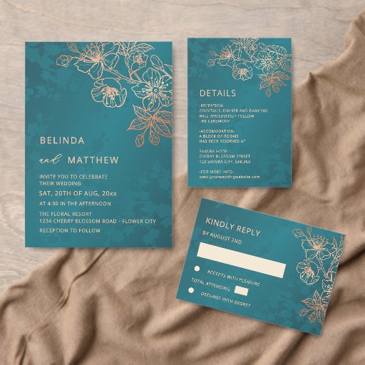 This elegant wedding invitation features rose gold line art flowers on a teal/ peacock green background.