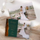 Send your family and friends a special wedding thank you with these custom photo cards. On the left, the words "thank you" appear in elegant gold-coloured handwriting script typography on a dark emerald green background over a brief, editable message of thanks to your wedding guests in copperplate font, with your names below. A burnt orange and rust watercolor agate border trimmed with faux gold glitter decorates the left edge. Easily add a vertical photo of the bride and groom to the right side. The back of the card provides space for a second, horizontal photo.