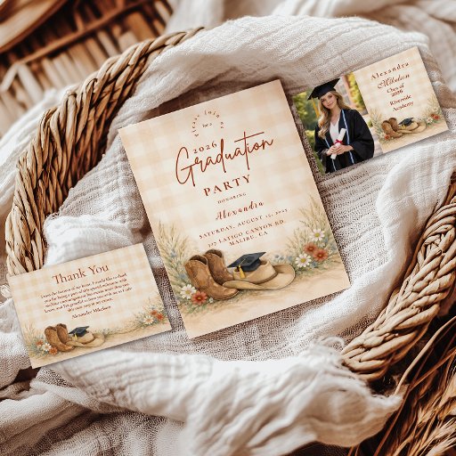 Celebrate your graduate with a warm western-inspired design featuring classic cowgirl boots, delicate wildflowers, and soft prairie grasses framing the layout. The earthy neutral palette of beige, sage, dusty blue, and warm terracotta creates a refined ranch aesthetic that feels both modern and timeless. Perfect for country-loving grads, rodeo girls, or anyone who dreams bigger under open skies. A beautiful blend of rustic charm and elegant botanical detail for a memorable graduation celebration.